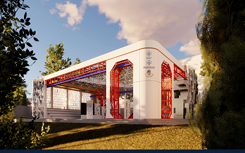 Специально для проекта был возведен павильон. Форма, объем и дизайн делают его яркой архитектурной доминантой рекреационной зоны «Артека». Благодаря огромным размерам, подсветке, оригинальной форме и современным материалам он привлекает внимание. При этом позволяет создать для детей безопасную, безбарьерную и комфортную среду. Павильон разделен на зоны для проведения различных мастер-классов, лекториев по темам строительства и ЖКХ.